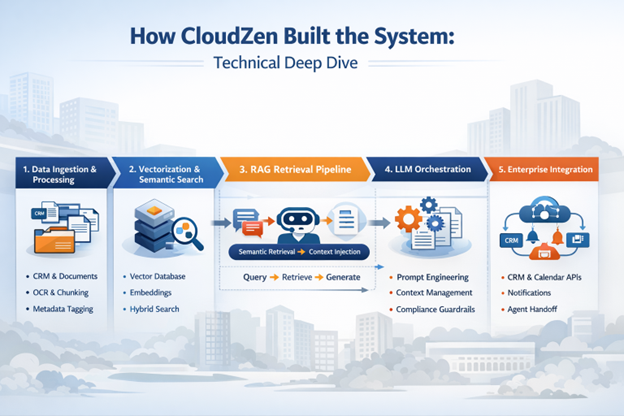 CloudZen Innovations combines deep AI engineering capabilities, strong real estate domain expertise, enterprise-grade architecture, and responsible AI governance to deliver production-ready solutions. Leveraging this foundation, CloudZen designed and implemented a secure, enterprise-grade Conversational AI platform powered by Large Language Models (LLMs) and Retrieval-Augmented Generation (RAG), purpose-built for the real estate industry.